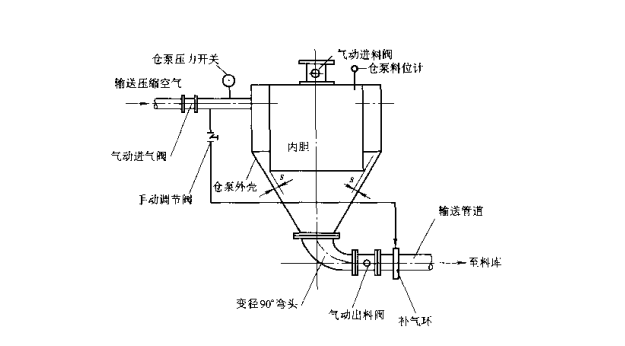 当L型仓泵内的物料全部被输送到料库后,仓泵内压力下降到预先设定的关泵压力时,仓泵压力开关输出信号,关闭气动进气阀、气动出料阀,开启气动进料阀,此时又恢复到仓泵装料状态。